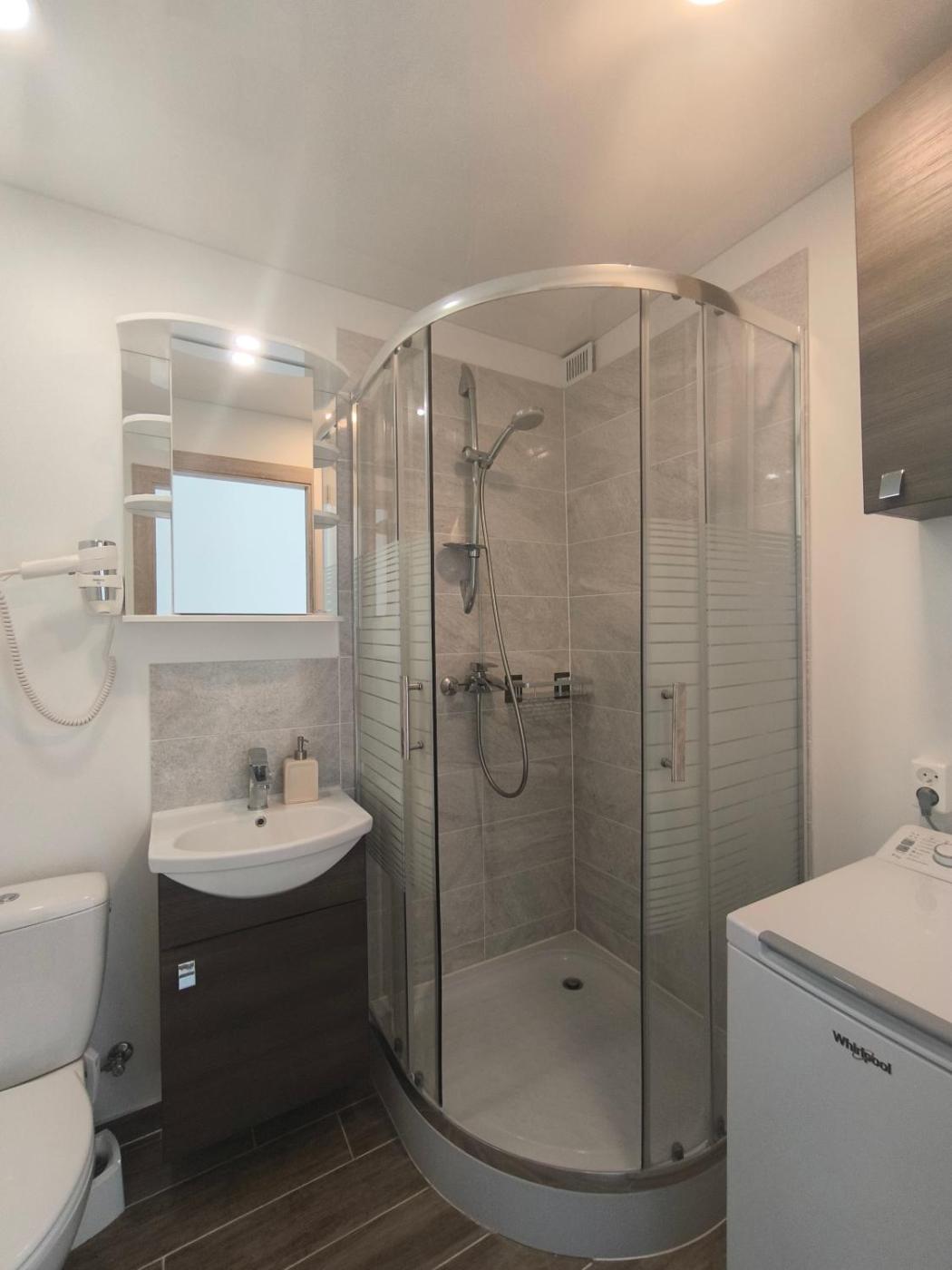 One-Bedroom Apartment. This apartment comprises 1 living room, 1 separate bedroom and 1 bathroom with a shower and free toiletries. The well-equipped kitchen features a stovetop, a refrigerator, kitchenware and an electric kettle. The air-conditioned apartment provides a flat-screen TV with cable channels, a washing machine, a seating area, a wardrobe as well as city views. The unit offers 2 beds.